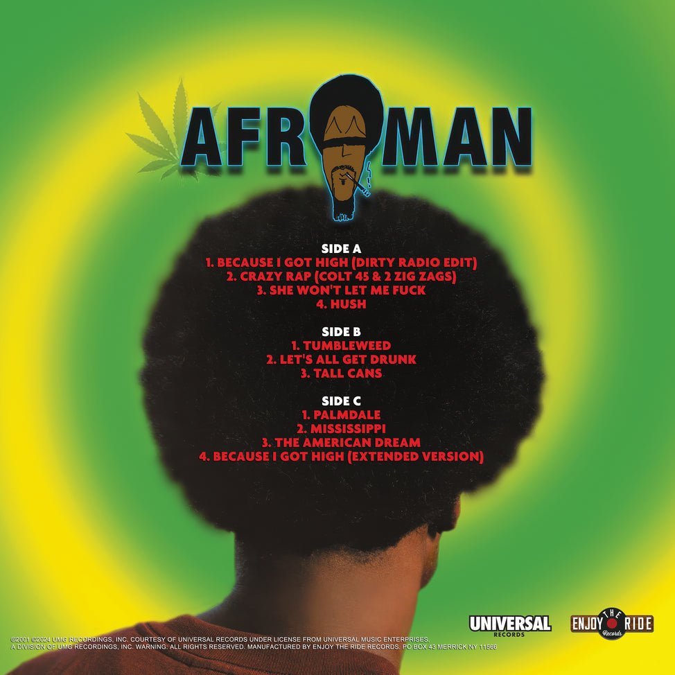Enjoy The Ride Records in conjunction with Universal Music Group proudly presents Afroman - The Good Times. This is the first official vinyl reissue in over two decades, just in time to celebrate 25 years of the hit single, "Because I Got High," which was originally released in the summer of 2000.